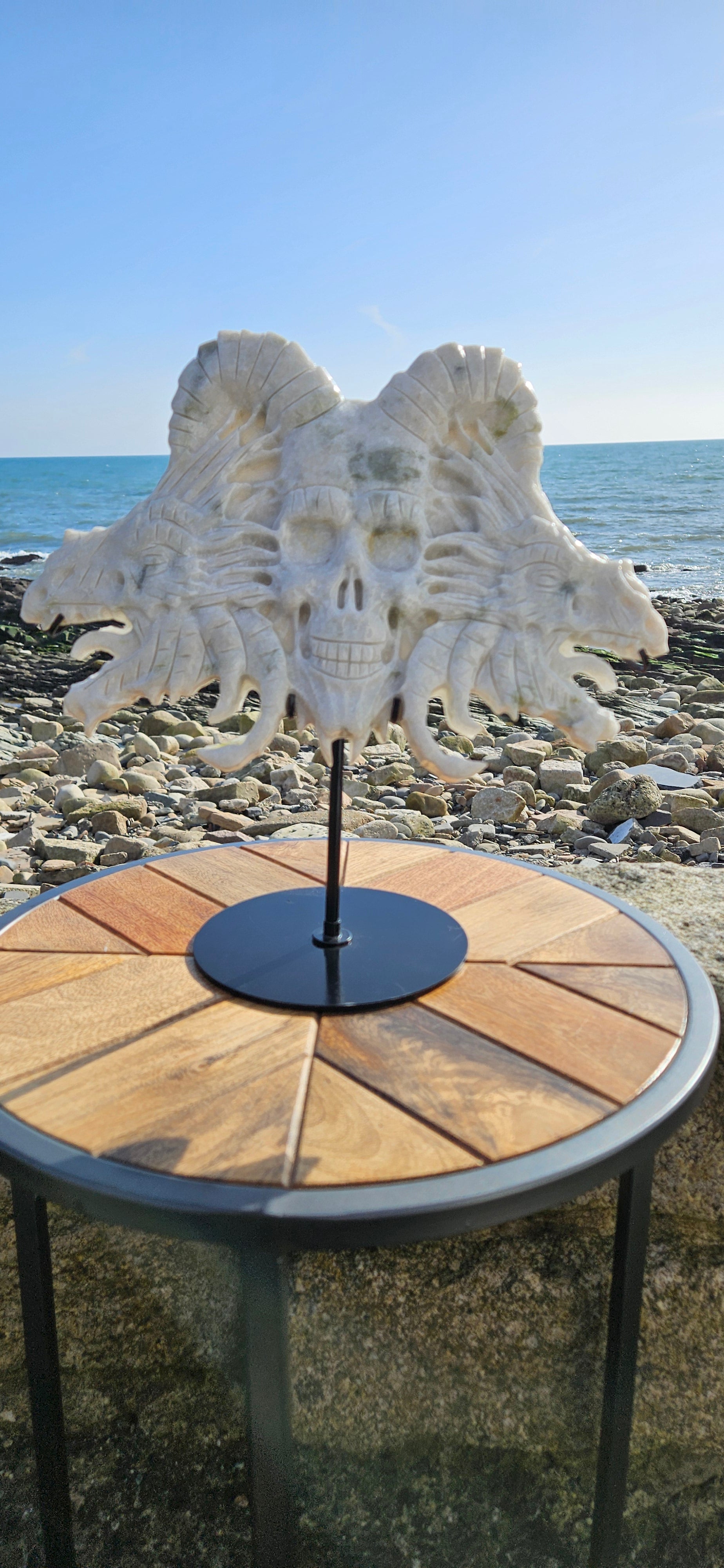 Weighing 2.2 kg, this large, solid piece features dramatic ram horns and twin dragon heads rising from the sides.